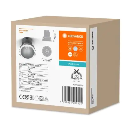 Goed om te weten is dat deze LED inbouwspot een zaagmaat heeft van 65mm en een diameter van 70mm. Dit wil zeggen dat het gat in het systeemplafond of het verlaagde plafond een afmeting dient te hebben van 65mm om het armatuur stevig in het plafond te bevestigen. De spot zelf is voorzien van twee handige klemmetjes, die uitzetten zodra het armatuur in de gat is geplaatst. Zo geregeld dus! Vanaf het moment van aanschaf ontvang je 3 jaar all-in garantie. Hierdoor ben je verzekerd dat de inbouwspot ook doet wat die hoort te doen: zonder problemen een ruimte verlichten!